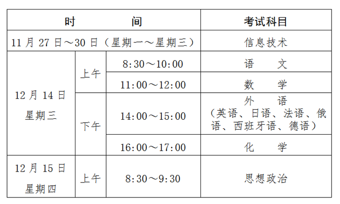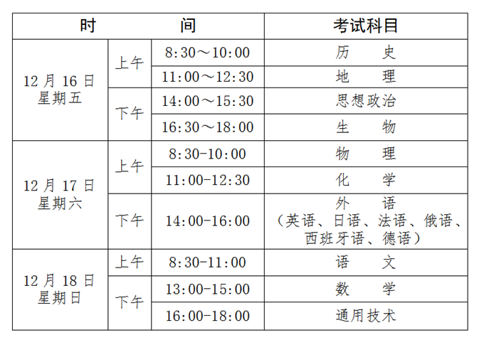 2.12月學(xué)業(yè)水平合格性科目為語(yǔ)文、數(shù)學(xué)、外語(yǔ)、化學(xué)、思想政治5個(gè)科目,時(shí)間為12月14日—15日。