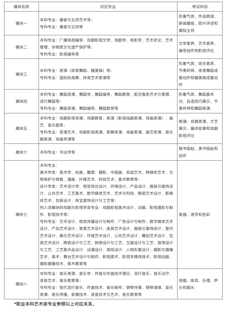安徽省2023年高考招生藝術(shù)類專業(yè)統(tǒng)一考試各模塊對應(yīng)專業(yè)及考試科目情況