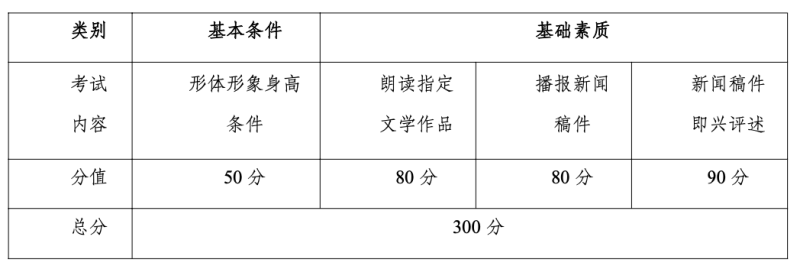 本考試共四個(gè)部分,分為基本條件、朗讀指定文學(xué)作品、播報(bào)新聞稿件、即興評述等 4 個(gè)部分,總分共計(jì) 300 分,各科目及分?jǐn)?shù)比重如下: