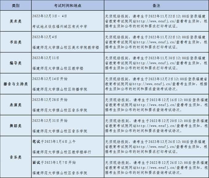 省級(jí)統(tǒng)考的音樂類、舞蹈類、播音與主持類、編導(dǎo)類、表演類、書法類等6個(gè)類別考點(diǎn)設(shè)在福建師范大學(xué)旗山校區(qū);美術(shù)類的考試地點(diǎn)設(shè)在福州城區(qū)標(biāo)準(zhǔn)化考點(diǎn)。