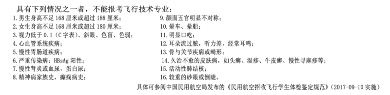 5.其他要求:各招飛院校具體標(biāo)準(zhǔn)及有關(guān)要求詳見院校官網(wǎng)發(fā)布的招生簡章。
