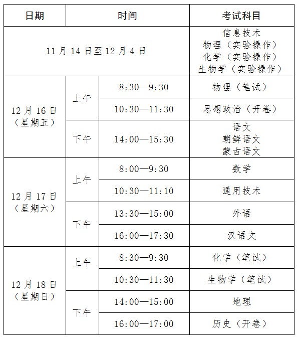 吉林省2022年下半年普通高中學業(yè)水平合格性考試日程表已經(jīng)發(fā)布,具體如下表: