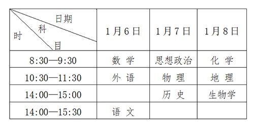 1.全省統(tǒng)一考試科目:思想政治、物理、歷史、地理、化學(xué)、生物學(xué)、語文、數(shù)學(xué)、外語??荚嚂r(shí)長:語文90分鐘,其余各科目60分鐘。具體時(shí)間安排如下: