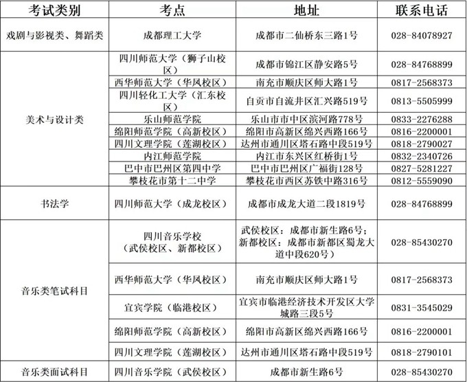 四川省藝術(shù)類專業(yè)統(tǒng)考各考點(diǎn)聯(lián)系電話