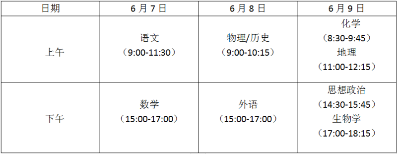 (二)考試時(shí)間。全國統(tǒng)考科目由教育部命題,按教育部規(guī)定時(shí)間組織考試。選擇性考試科目由廣西壯族自治區(qū)自主命題,每門考試時(shí)長(zhǎng)均為75分鐘,與全國統(tǒng)考科目的考試同期安排,如全國統(tǒng)考科目有調(diào)整,選擇性考試科目的考試安排相應(yīng)調(diào)整。具體考試時(shí)間安排如下: