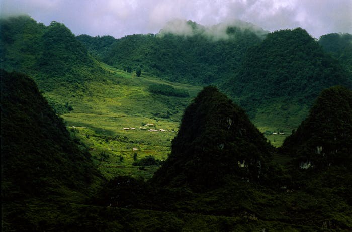 高峽流云,人隨飛鳥穿云去。數(shù)峰著雨。相對(duì)青無語。